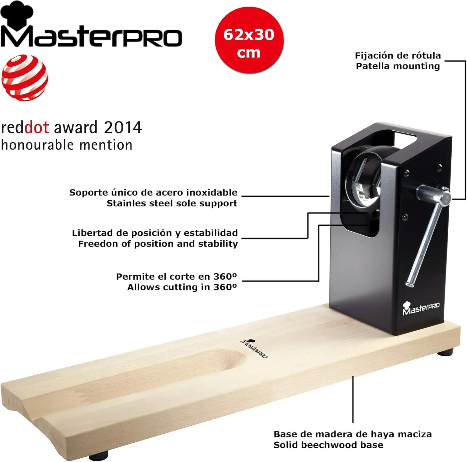 Hice mis pruebas de esta jamonera sobre una encimera de granito estable para probar la firmeza que promete. Al armarla notarás que su base es de haya maciza que mide 62 x 30 cm, lo cual es un buen tamaño para una pieza. Lo que me pareció interesante fue su soporte de hierro de 27 x 15 x 10 cm que incluye un sistema de rótula con bola de nylon con el que vas a poder mover el jamón con total libertad y sin perder la estabilidad.