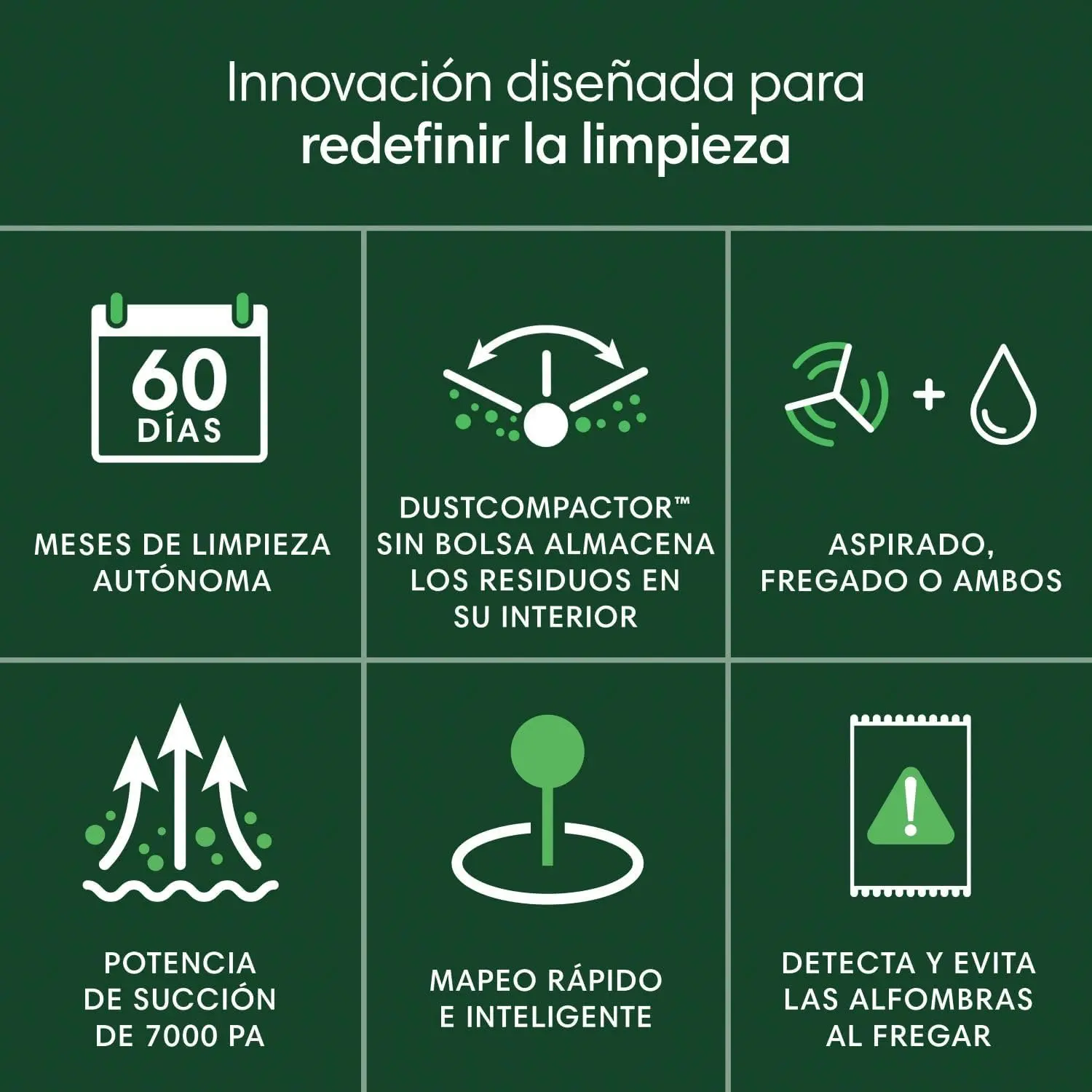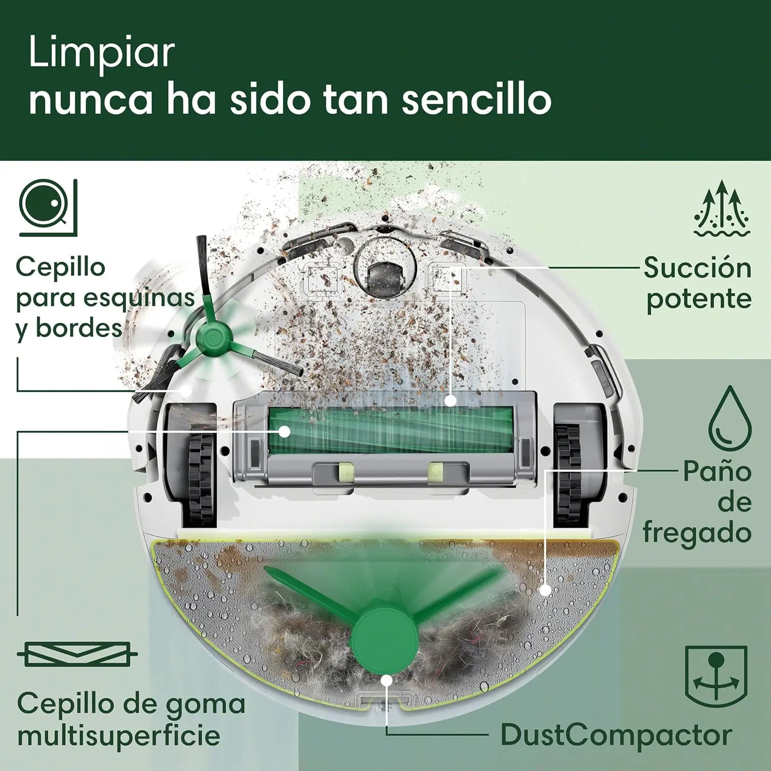 Este es un robot aspirador que tiene un equilibrio entre una buena autonomía combinado con una gran potencia que compacta toda la suciedad para un mantenimiento muy fácil.