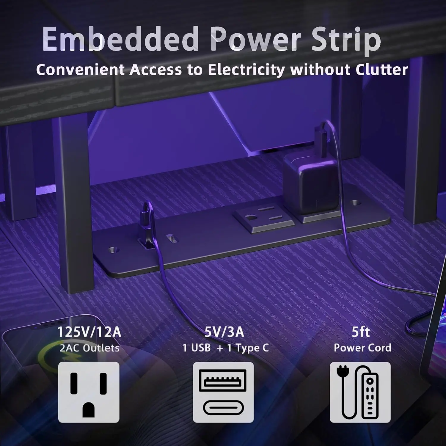 Lo que más te gustará es su formato en L (120 x 70 cm) donde vas a poder colocar dos pantallas sin sentirte que quedan apretadas, algo que no suele encontrarse en modelos de esta gama. Además, con su regleta integrada vas a poder reducir hasta un 40% de cales visibles que suelen ser tan molestos. Incluye 2 tomas estándar y 2 puertos USB para que cargues tus dispositivos La iluminación LED es ese toque que todo gamer necesita para sentirse dentro de la pantalla.
