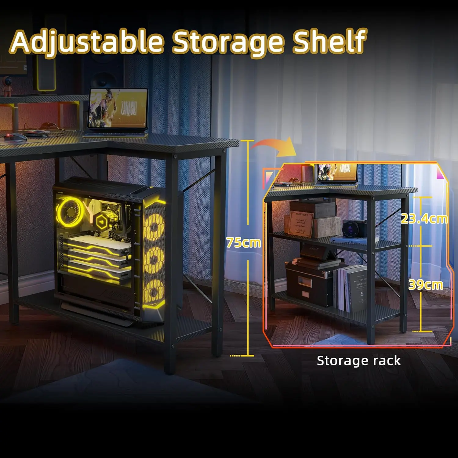 Es un escritorio que me parece muy novedoso porque incluye estantes de almacenamiento y un diseño reversible, así que vas a poder adaptarlo a tu espacio sin dificultad. Si tienes una setup con consola , altavoces o varios periféricos, en esta mesa vas a tener el espacio para ubicarlos. La regleta integrada te dará la comodidad de tener todo más ordenado y sin necesidad de tener regletas en el suelo. Por eso es una mesa gaming ideal para espacios pequeños.